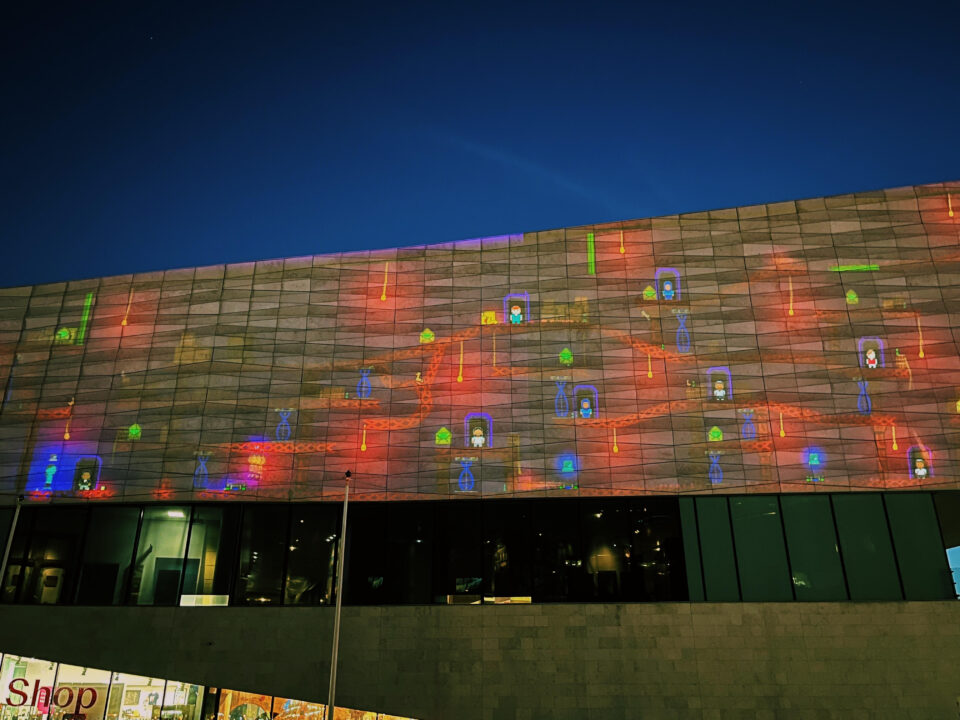 Projecting onto a Liverpool landmark meant that the game’s design took into consideration the shape and curves of the museum. We were also mindful that it would be displayed during the evening. As a result, we played around with heavy light intensities to decide which colours would be most visible to the players inside the game pod.